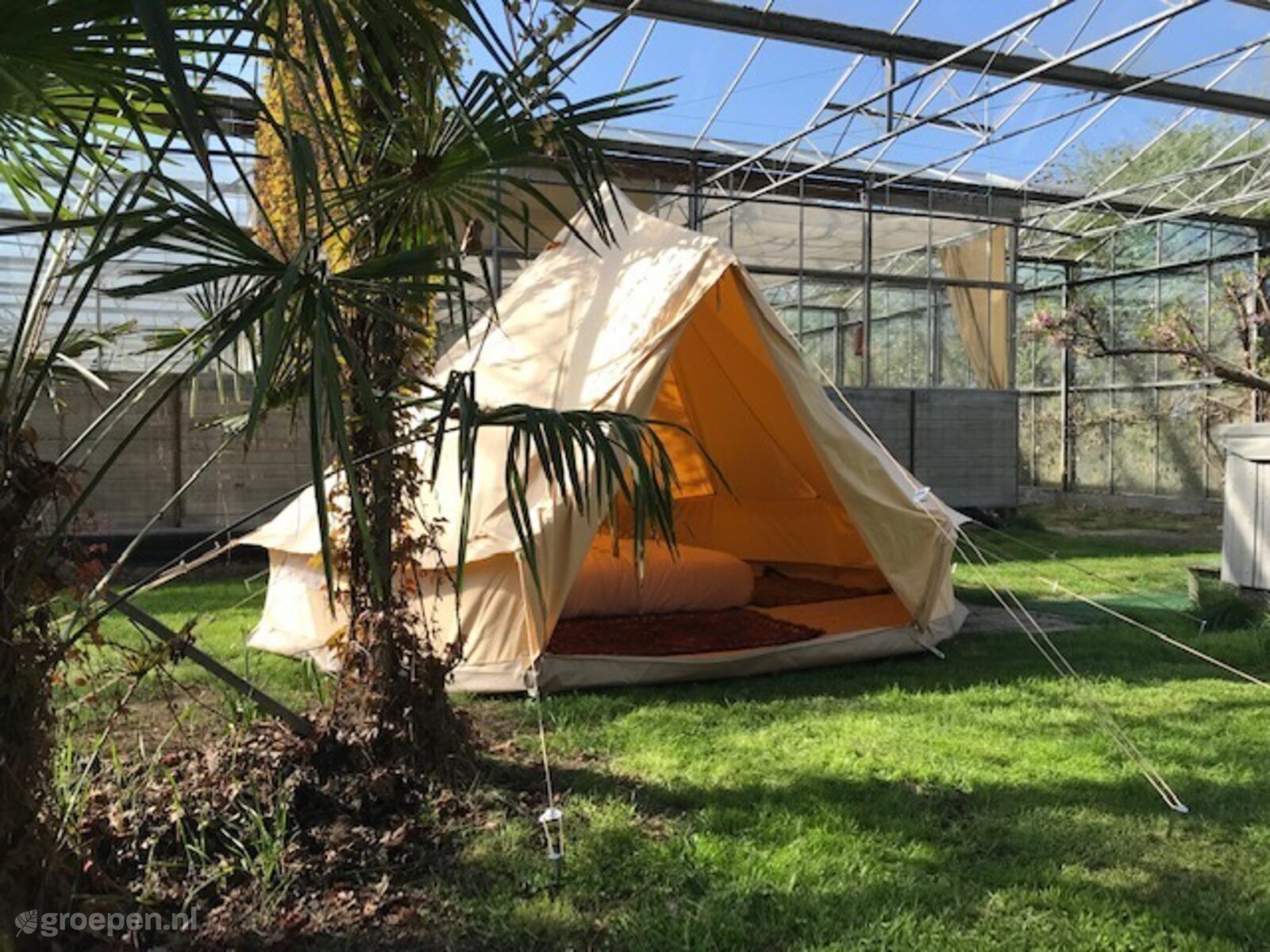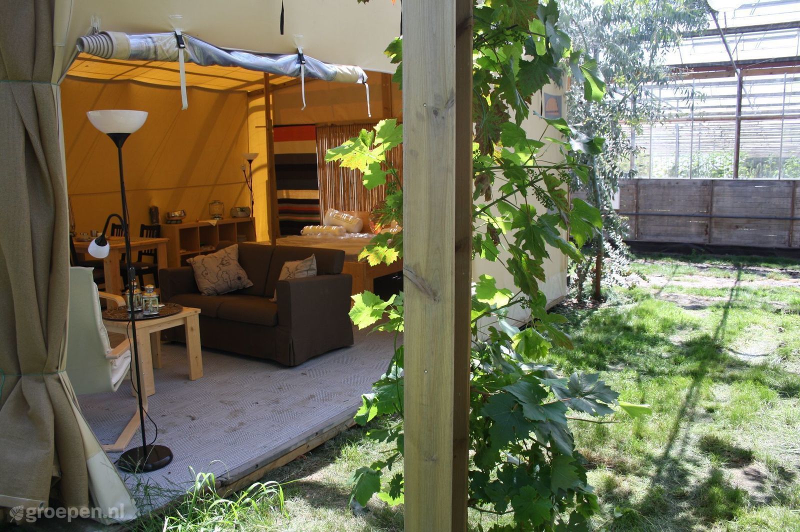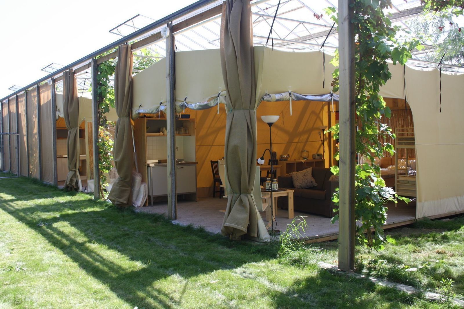 Groepsaccommodatie Lutjebroek Onze accomodatie bestaat uit 5 grote 4 persoons safaritenten die naast elkaar staan in onze bloemenkas! De gevel aan de noordkant is geheel verwijdert zodat er glazen afdak is ontstaan.